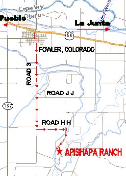 Fowler is about 1/2 hour East of Pueblo on Hwy 50, or 1/2 hour West of of La Junta on Hwy 50. Upon arriving in Fowler, Turn South on Main Street. Turn East on Park Turn South on Road 3 (at first Stop sign) continuing out of town to the T at Road HH Turn East on Road HH continuing to first road on right Turn South on Road 4, this will then turn to dirt Stay to Right to enter under Apishapa Ranch arch |